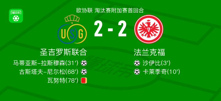 北京时间2月16日欧协联 淘汰赛附加赛首回合,圣吉罗斯联合主场对阵法兰克福。圣吉罗斯联合马蒂亚斯-拉斯穆森破门,古斯塔夫-尼尔松破门。法兰克福沙伊比破门,卡莱季奇破门。最终比分2-2。