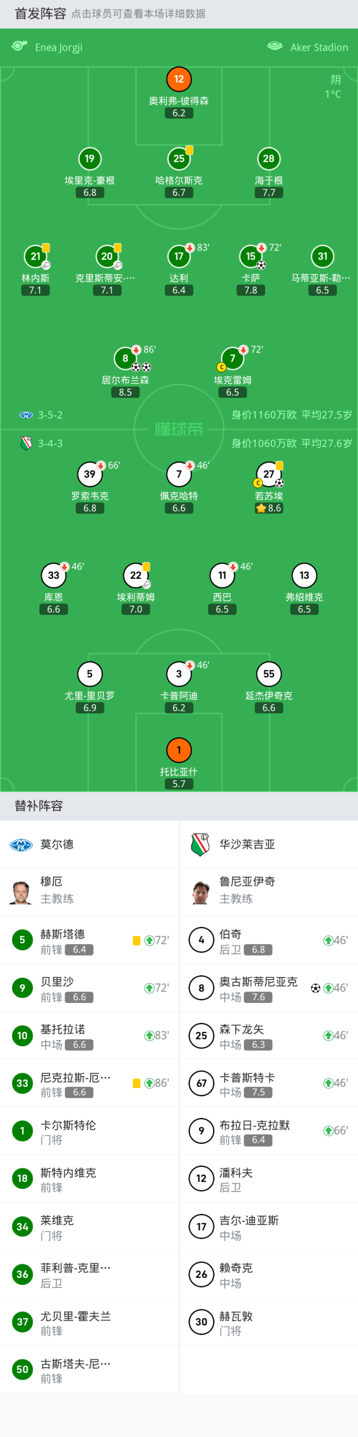 莫尔德首发:8-居尔布兰森, 7-埃克雷姆, 21-林内斯, 28-海于根, 17-达利, 19-埃里克-豪根, 20-克里斯蒂安-埃里克森, 15-卡萨, 25-哈格尔斯克, 12-奥利弗-彼得森, 31-马蒂亚斯-勒维克