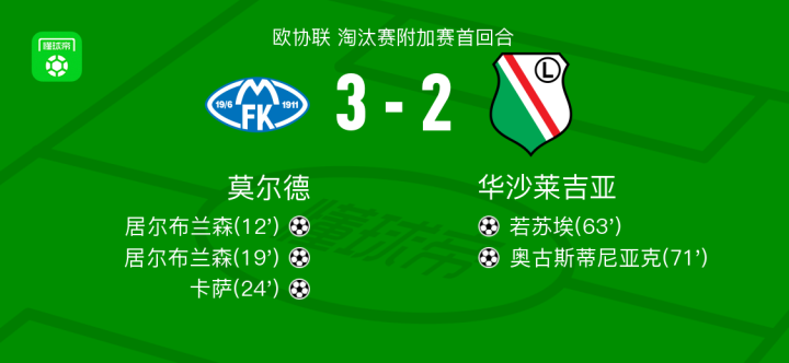 北京时间2月16日欧协联 淘汰赛附加赛首回合,莫尔德主场对阵华沙莱吉亚。莫尔德居尔布兰森梅开二度,卡萨破门。华沙莱吉亚若苏埃破门,奥古斯蒂尼亚克破门。最终比分3-2。