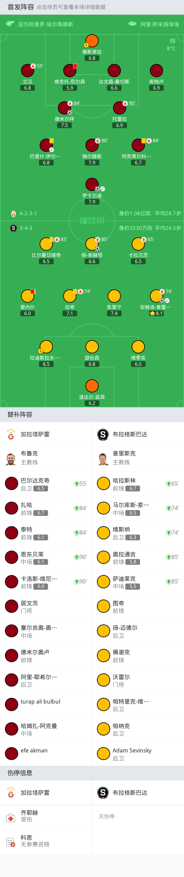 替换下场:90'+110-梅尔滕斯, 55'23-艾汉, 84'8-德米尔拜, 90'+134-托雷拉, 84'7-阿克蒂尔科奥卢