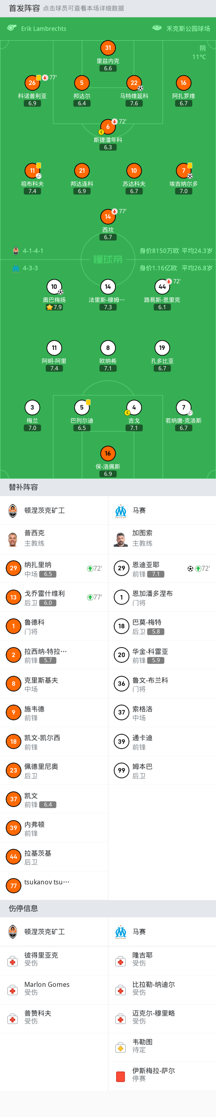 欧联淘汰附加赛首回合:顿涅茨克矿工2-2马赛,奥巴梅扬传射