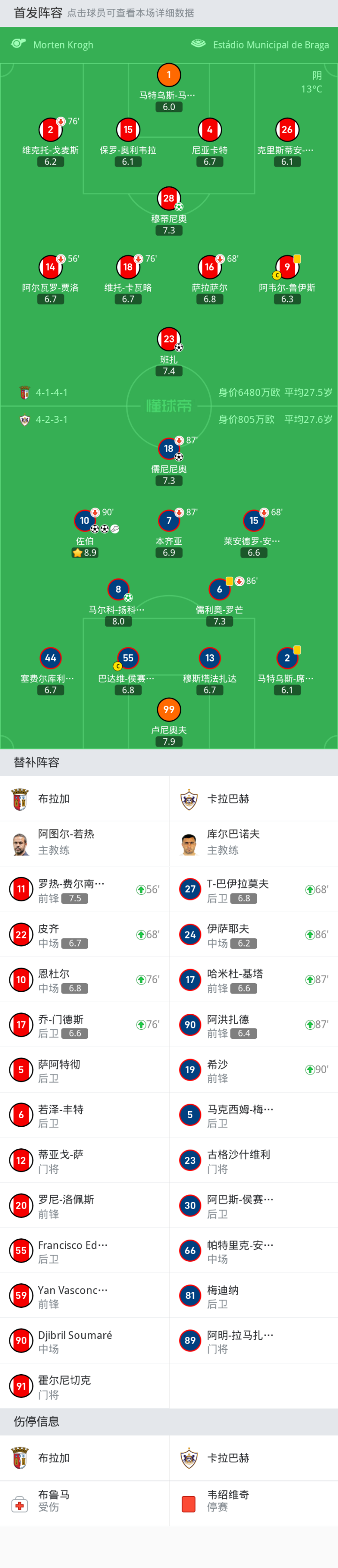 布拉加首发:28-穆蒂尼奥, 15-保罗-奥利韦拉, 1-马特乌斯-马加良斯, 23-班扎, 26-克里斯蒂安-博尔哈, 9-阿韦尔-鲁伊斯, 18-维托-卡瓦略, 2-维克托-戈麦斯, 4-尼亚卡特, 16-萨拉萨尔, 14-阿尔瓦罗-贾洛