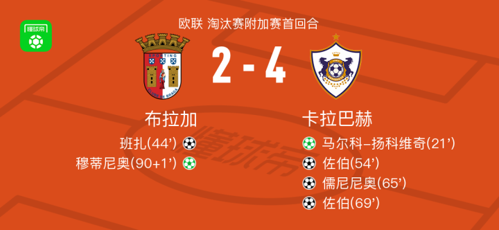 北京时间2月16日欧联 淘汰赛附加赛首回合,布拉加主场对阵卡拉巴赫。布拉加班扎破门,穆蒂尼奥破门。卡拉巴赫马尔科-扬科维奇破门,佐伯梅开二度,儒尼尼奥破门。最终比分2-4。