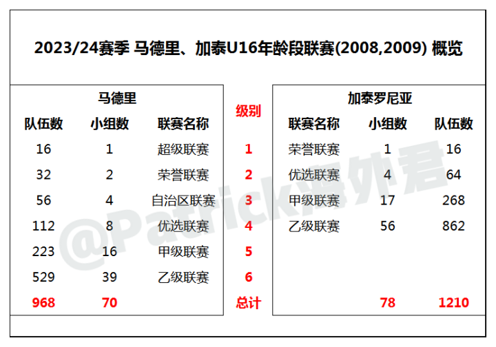 3. 球队数量不同。加泰4个级别各组均为最多16支球队,马德里前两级联赛为每组16队,第3级别至第6级别为每组最多14支球队;从整个联赛体系来看,加泰U16联赛各级别球队数量分别为16-64-268-862——球队数量跨度大,金字塔塔基更广、数量更多,而马德里U16联赛体系级别更多,各级别球队数量跨度更小,区分相对更细致。