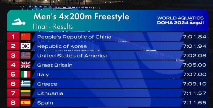 北京时间2月17日,中国队在多哈进行的世界泳联世锦赛的4x200米男子自由泳接力决赛中力压韩国队夺冠,这是中国队首次夺得4x200米男子自由泳接力世界大赛的冠军。