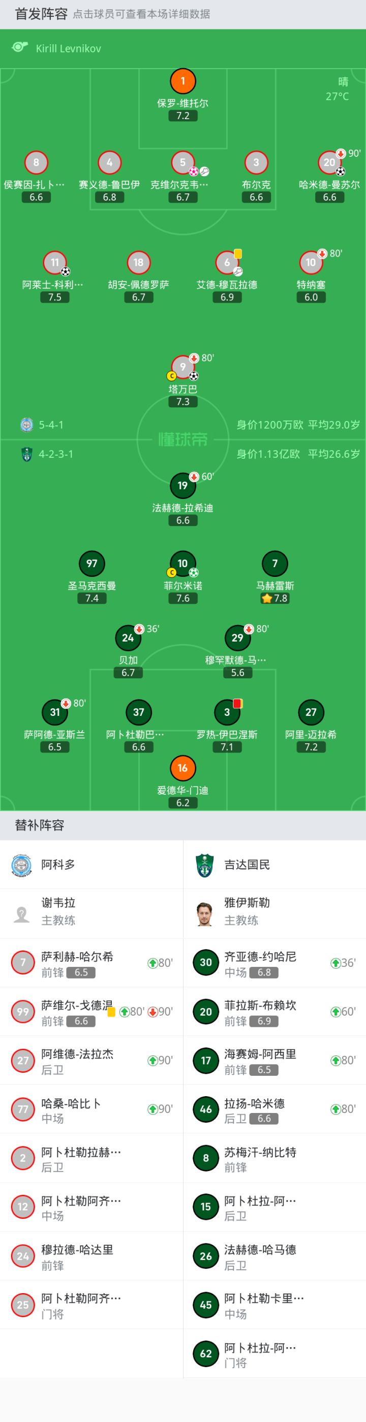 阿科多首发:5-克维尔克韦利亚, 1-保罗-维托尔, 9-塔万巴, 10-特纳塞, 3-布尔克, 20-哈米德-曼苏尔, 4-赛义德-鲁巴伊, 11-阿莱士-科利亚多, 18-胡安-佩德罗萨, 6-艾德-穆瓦拉德, 8-侯赛因-扎卜达尼
