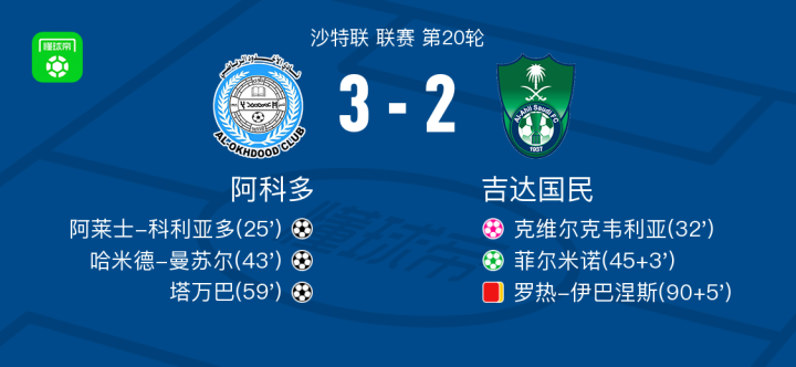 北京时间2月17日沙特联 联赛 第20轮,阿科多主场对阵吉达国民。阿科多阿莱士-科利亚多破门,哈米德-曼苏尔破门,塔万巴破门,克维尔克韦利亚自摆乌龙。吉达国民菲尔米诺破门。最终比分3-2。