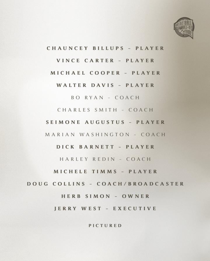 据美联社报道,入选名单的有:文斯-卡特、昌西-比卢普斯、前湖人后卫迈克尔-库珀、太阳队史得分王沃尔特-戴维斯、四届WNBA冠军塞蒙-奥古斯都、前威斯康辛教练博-瑞安、路易斯安那州历史胜场最多高中教练查尔斯-史密斯、前堪萨斯主帅玛丽安-华盛顿、澳大利亚后卫米歇尔-蒂姆斯、三届NAIA冠军迪克-巴尼特、六届AAU冠军教练哈雷-雷丁、前球员兼教练道格-科林斯、步行者老板赫伯-西蒙、杰里-韦斯特(此前以球员身份入选)