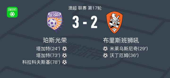 北京时间2月17日澳超 联赛 第17轮,珀斯光荣主场对阵布里斯班狮吼。珀斯光荣塔加特梅开二度,科拉科夫斯基破门。布里斯班狮吼米莱乌斯尼奇破门,沃丁厄姆破门。最终比分3-2。