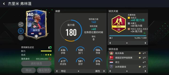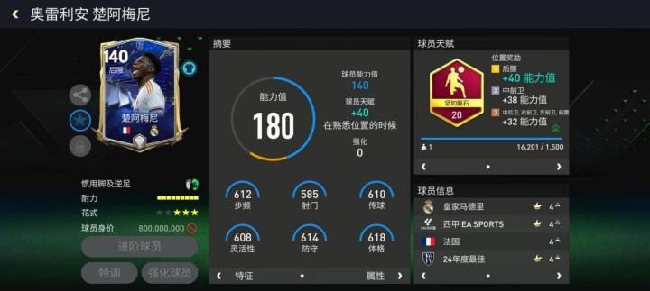 年度最佳楚阿梅尼基础能力值给到了140,在搭配坚如磐石天赋之后,他的各项数据都在600左右,有着很高的性价比。