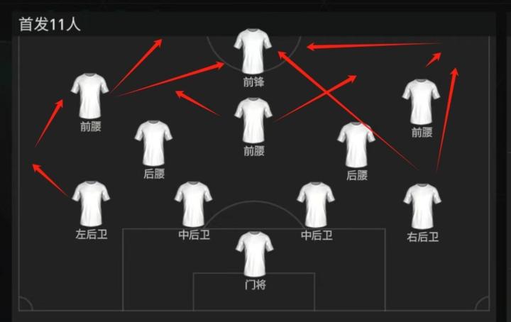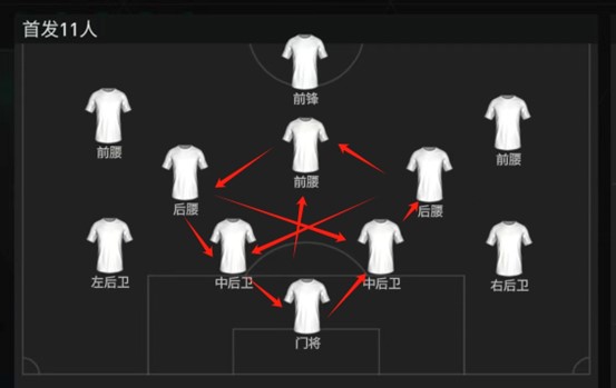 左边后卫拿球后可以尽量多往边路带球,给左边前腰争取更多的跑位空间,待空间出现后一脚穿越球直接过渡到前场,与此同时居中前腰及时赶往肋部接应,两人在肋部二过一配合形成压力,给前锋争取跑位空间,空间产生后挑传打身后形成单刀;右路起球的话则可以用右边后卫直接带球往肋部内切,或者沿用左路的进攻思维。