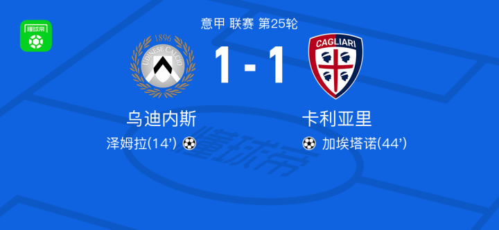 北京时间2月18日意甲 联赛 第25轮,乌迪内斯主场对阵卡利亚里。乌迪内斯泽姆拉破门。卡利亚里加埃塔诺破门。最终比分1-1。