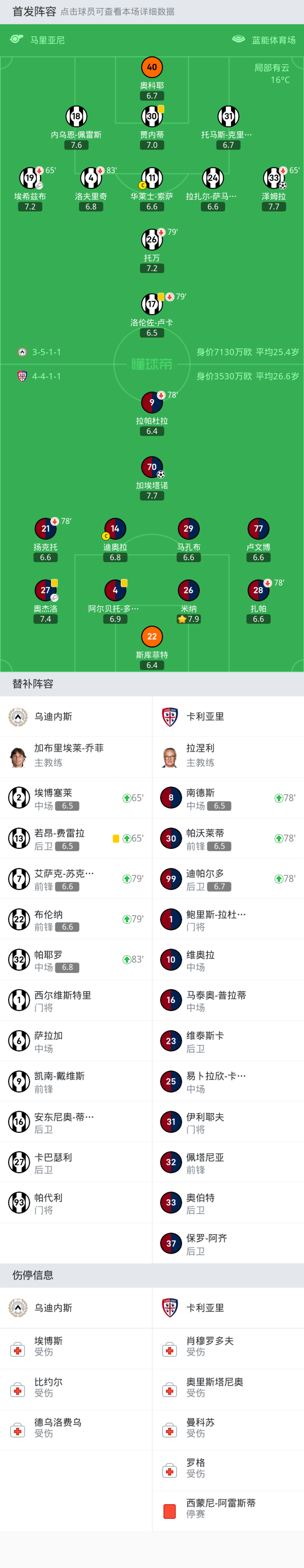 卡利亚里首发:9-拉帕杜拉, 27-奥杰洛, 22-斯库菲特, 26-米纳, 14-迪奥拉, 21-扬克托, 4-阿尔贝托-多塞纳, 29-马孔布, 70-加埃塔诺, 28-扎帕, 77-卢文博