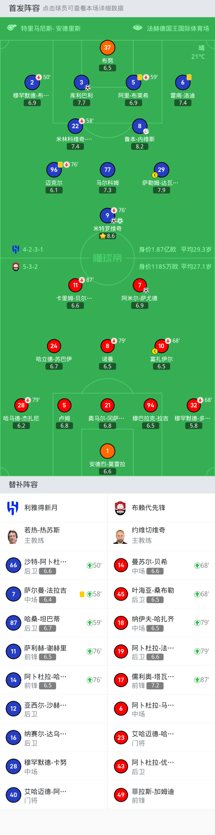 利雅得新月首发:3-库利巴利, 37-布努, 29-萨勒姆-达瓦萨里, 9-米特罗维奇, 8-鲁本-内维斯, 22-米林科维奇-萨维奇, 2-穆罕默德-布莱克, 77-马尔科姆, 5-阿里-布莱希, 6-雷南-洛迪, 96-迈克尔