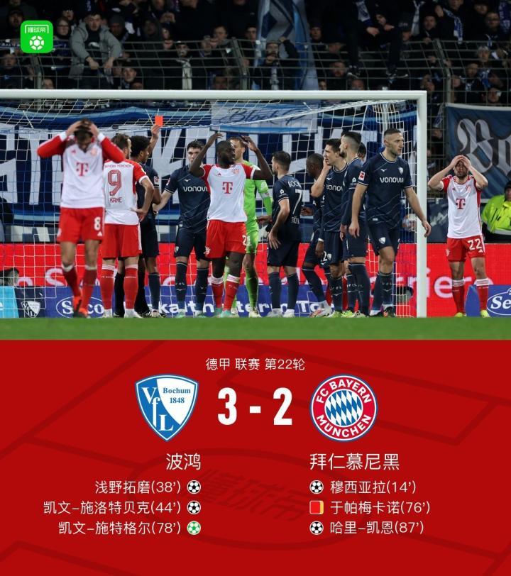 北京时间2月19日00:30,德甲第22轮继续进行,拜仁慕尼黑作客沃诺维亚鲁尔球场挑战波鸿,本场主裁判为施拉格尔。上半场,穆西亚拉小角度爆射首开记录,凯恩错失单刀;随后场上风云突变,浅野拓磨与凯文-施洛特贝克接连破门助波鸿逆转。下半场,于帕梅卡诺送点+累计两黄被罚下,施特格尔点射助波鸿扩大优势,凯恩终场前扳回一城。最终,拜仁客场2-3不敌波鸿,遭各项赛事3连败+与榜首勒沃库森之间的积分差距被拉大至8分。