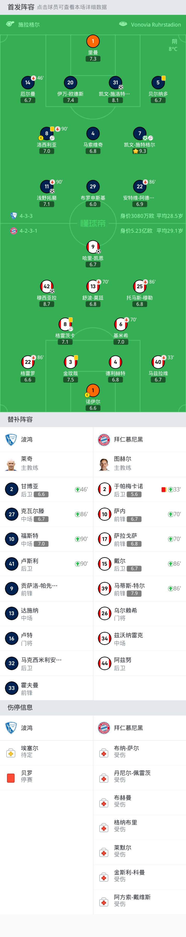 替换下场:70'13-舒波-莫廷, 86'25-托马斯-穆勒, 86'22-格雷罗, 70'6-基米希, 33'40-马兹拉维