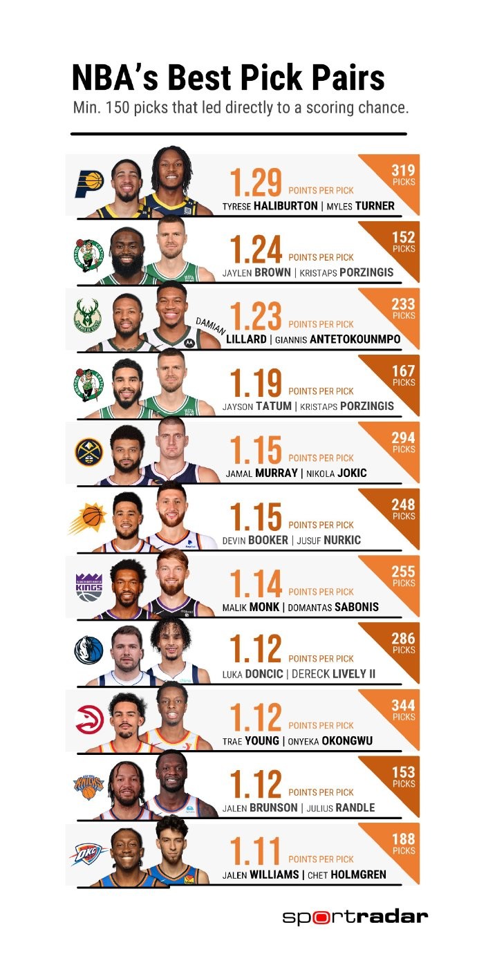 NBA本赛季挡拆搭档每次挡拆得分排名:哈利伯顿&特纳第一每天锻炼一千卡 @懂球帝2024-02-19 08:03本赛季的挡拆搭档每次挡拆得分排名(至少150次通过挡拆直接创造得分)。值得一提的是,库里+追梦每次挡拆创造1.34分,但总挡拆次数146,未达到150次没有上榜。展开更多