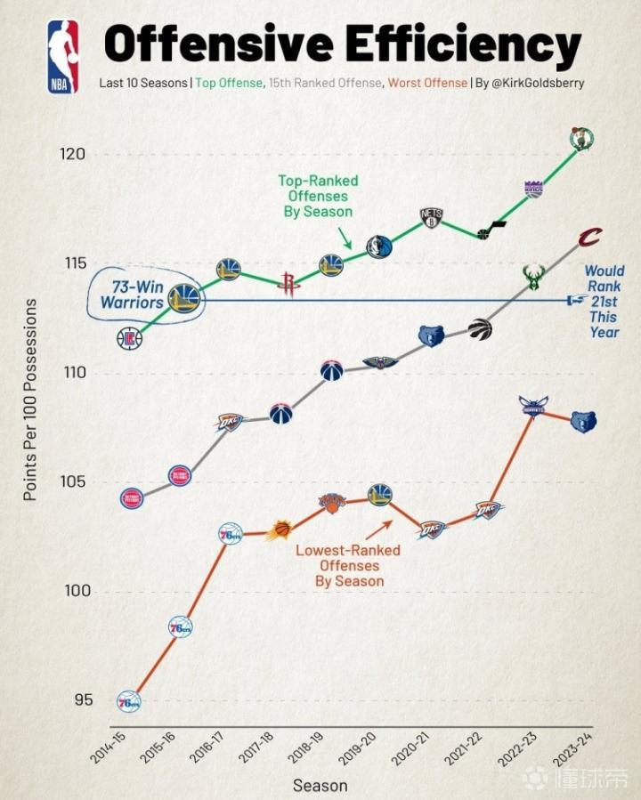 Kirk Goldsberry表示,15-16赛季的73胜勇士放在本赛季,他们的进攻效率(114.9)仅能排在第21位。本赛季进攻效率排名第一的是凯尔特人,进攻效率超过120(121.7)。