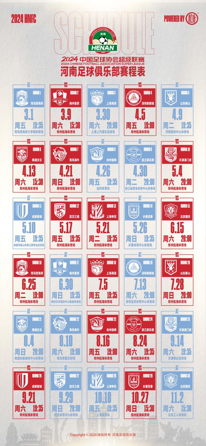 2024中国足球协会超级联赛河南足球俱乐部赛程表出炉,敬请保存收藏!