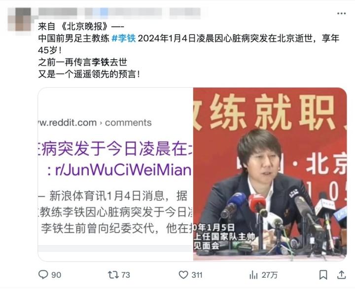 一眼假!外网传李铁心脏病发作去世,但相关描述漏洞百出