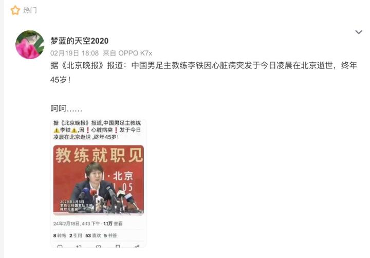 近几天,微博陆续有数个账号传播“前国足主帅李铁因心脏病突发去世”的消息,开始传播范围不广,只有几个所谓的“时政博主”、“军事博主”发布,但今天又有足球体育博主转发了这个消息。