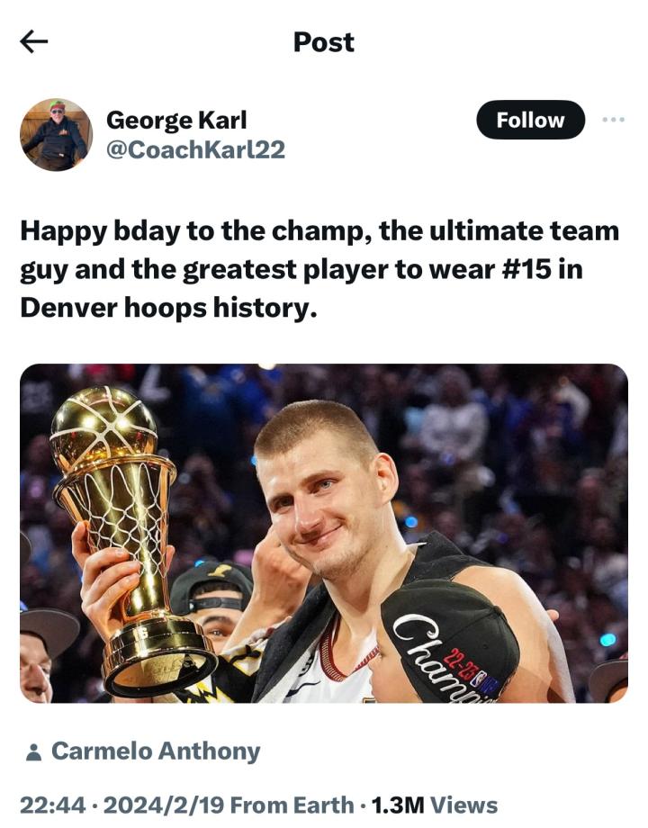 北京时间2月20日,前掘金队主帅乔治-卡尔发表动态,祝贺掘金队当家球星尼古拉-约基奇生日快乐,并在下方标记了卡梅隆-安东尼。