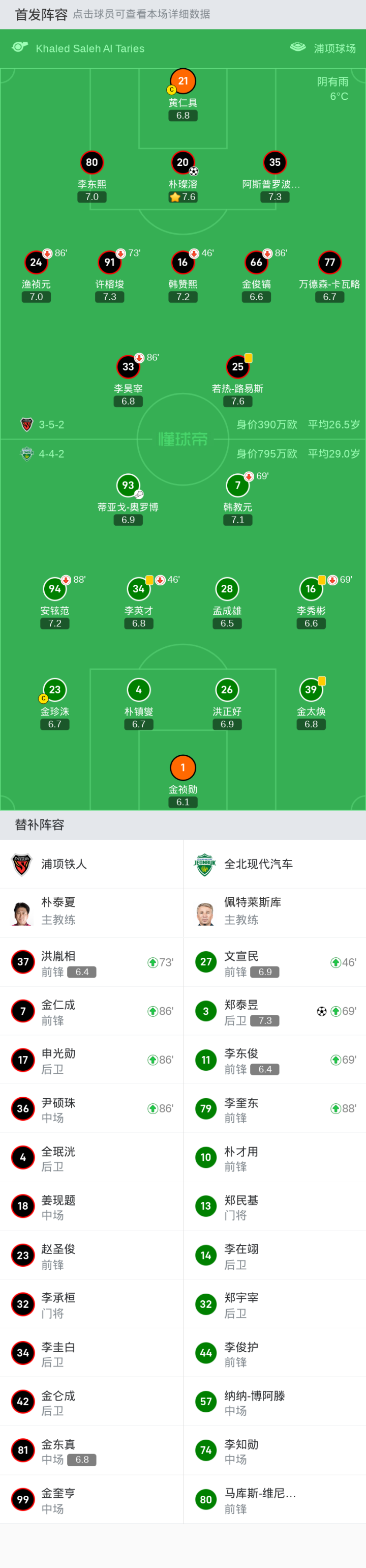 浦项铁人首发:77-万德森-卡瓦略, 91-许榕埈, 35-阿斯普罗波塔米蒂斯, 20-朴璨溶, 21-黄仁具, 16-韩赞熙, 25-若热-路易斯, 80-李东熙, 33-李昊宰, 24-渔祯元, 66-金俊镐