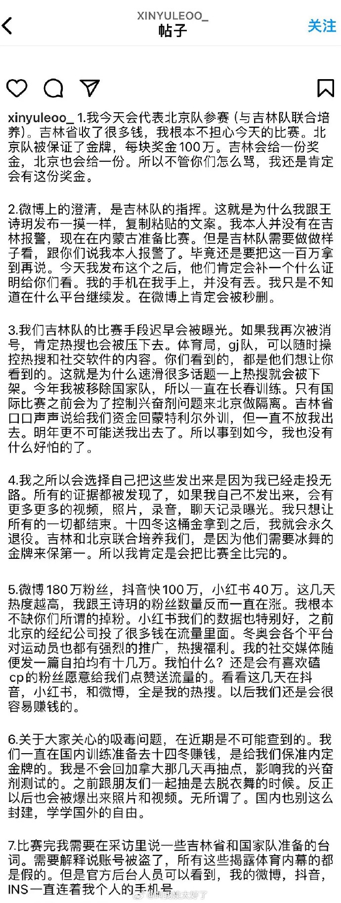 来都来了就吃口瓜再走继昨日(2月20日)花滑运动员柳鑫宇被曝出约炮、吸毒、贪污等问题后,今日外网账号再次跟进曝光相关内容,并针对柳鑫宇的回应进行了解释。