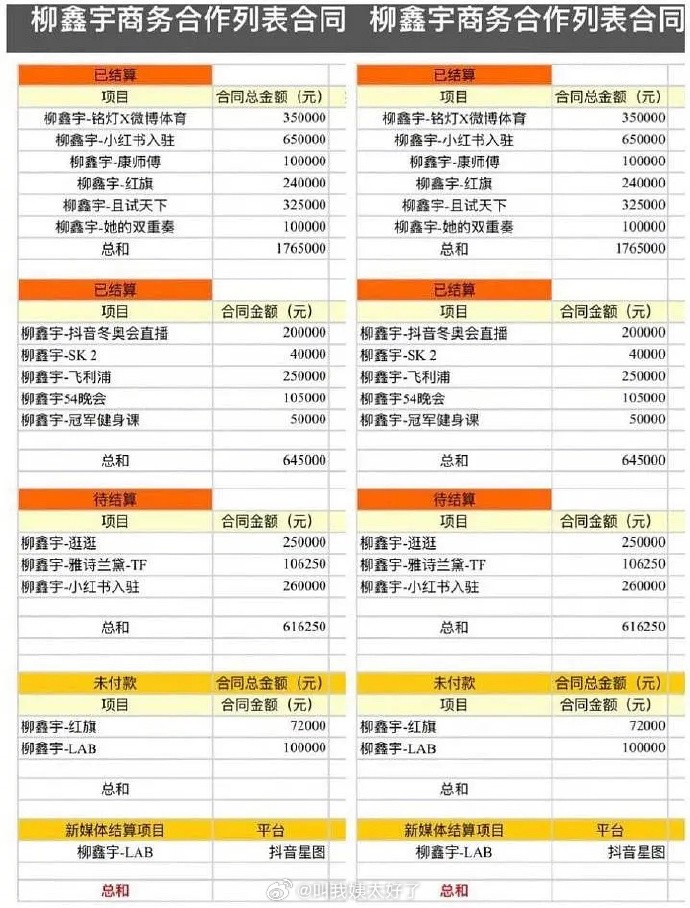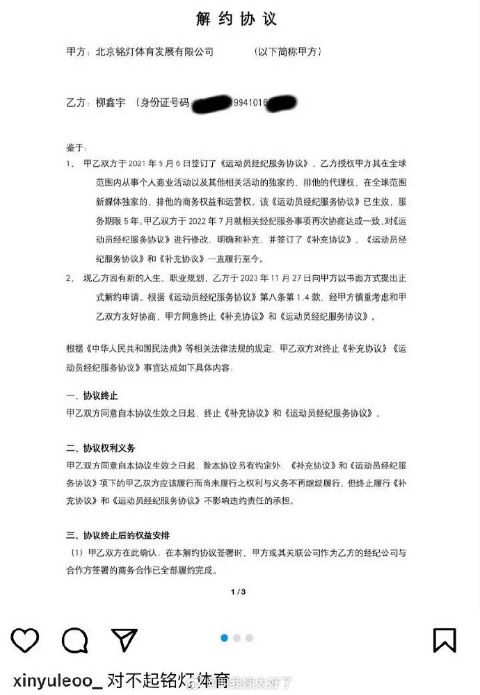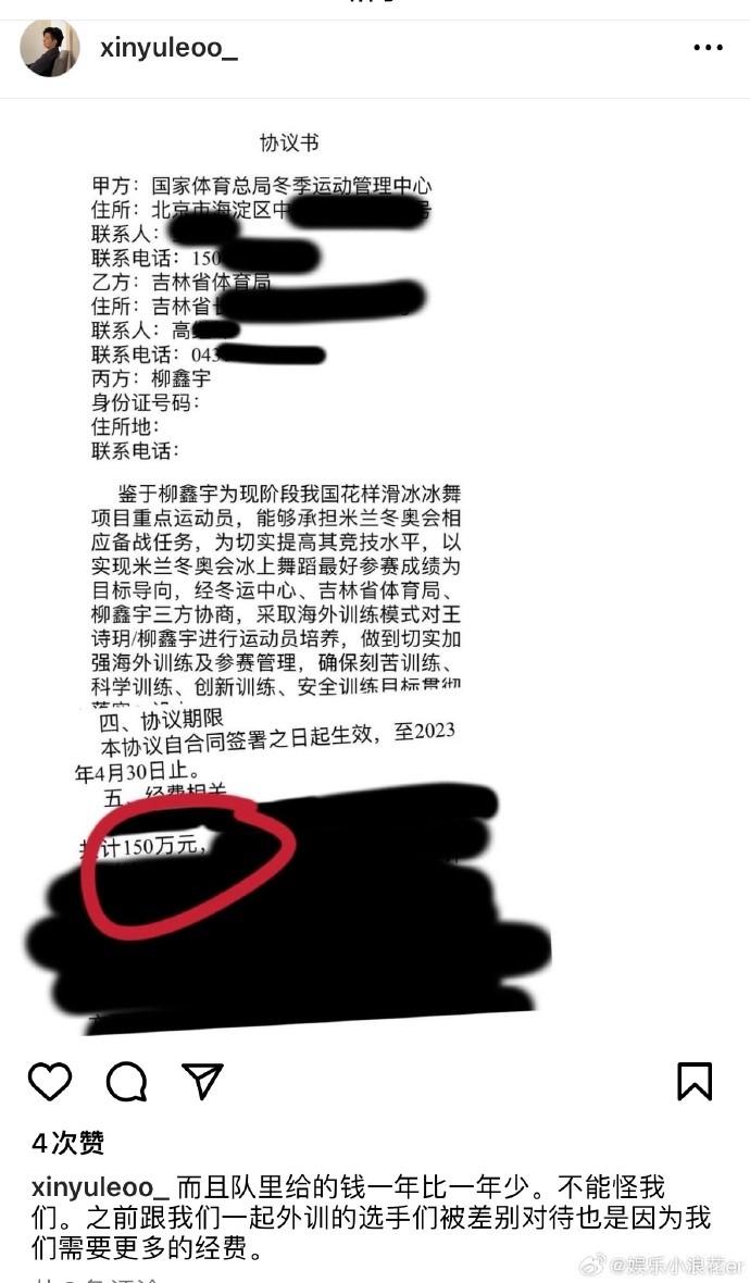此外还曝光了一些合同,包括国家体育总局冬季运动管理中心、吉林省体育局和柳鑫宇的运动员培养合同,培养经费共计150万。商业合同中包含与各大平台及品牌的合作,总金额超过了300万,但同时也曝光了柳鑫宇与代理公司铭灯体育的解约协议。