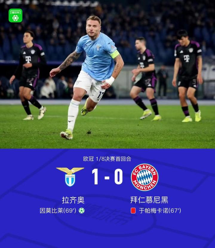 蓝鹰主场击退拜仁,或许是首回合最大的冷门。放弃整活重拾4231传统、首发代表欧冠光荣的穆勒等纠错举动,没能让拜仁回到自救轨道。面对本季意甲排名第8的拉齐奥,上半场还能占据上风的德甲冠军,却在半场休息过后判若两队,攻防两端完全失据:进攻端重蹈低效控球和频繁失误的沉闷,防守端的定时炸弹又如期暴雷。第67分钟,乌帕梅卡诺禁区内犯规被主裁判施以红点极刑,因莫比莱点射建功,打进全场唯一进球。