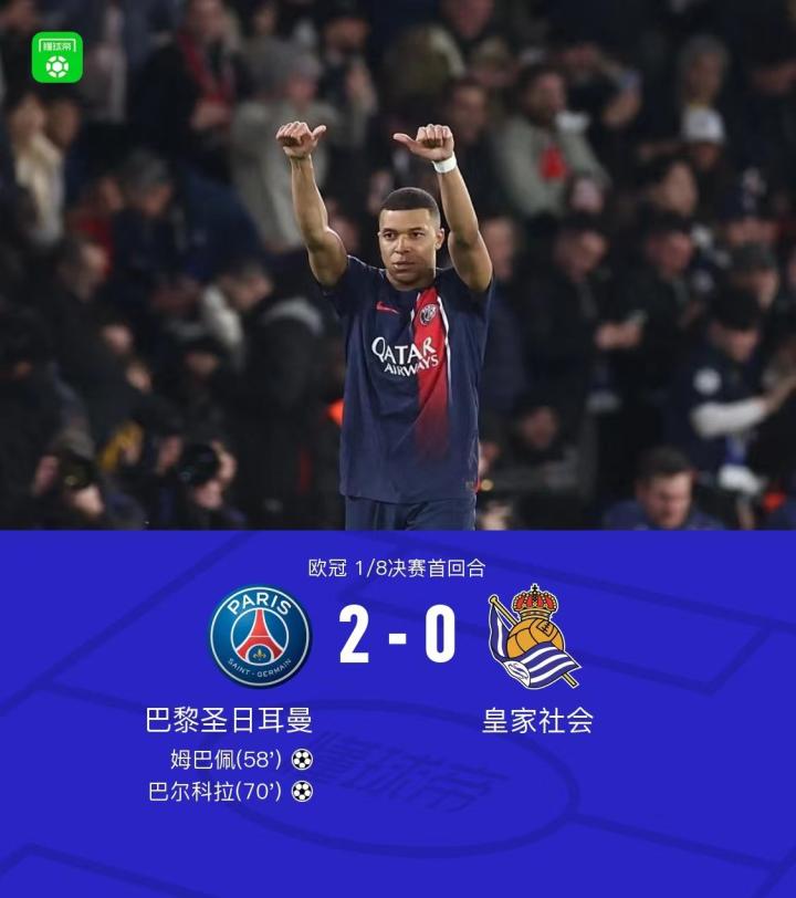 李刚仁缺席,欧冠赛场的亚洲德比只得日后再议。面对整体性极强的皇家社会,恩里克选择了充分信任麾下球星。巴尔科拉、姆巴佩、登贝莱三箭齐发,姆巴佩顶在突前位置。虽然削减了持球分量,但姆巴佩仍能令对方防守提心吊胆。大巴黎的第一个进球,便来自角球进攻中姆巴佩的后点包抄。