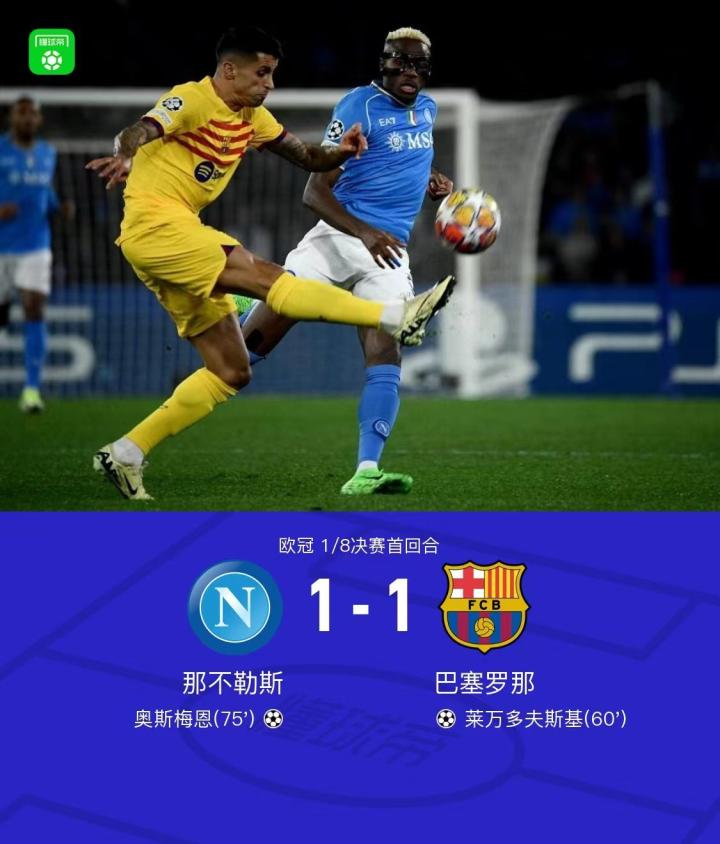16岁223天,亚马尔成为欧冠淘汰赛历史上最年轻的出场球员。然而,或许是连轴打满全场的疲惫,纪录之夜的亚马尔,此役并无过多惊艳发挥。反而是阵中最高龄的莱万多夫斯基,在客场亮剑出鞘,帮助巴萨打破1078天的欧冠淘汰赛进球荒。那不勒斯的头牌前锋奥斯梅恩,则在被阿劳霍闷杀70多分钟后,终于在另一名中卫伊尼戈-马丁内斯的防区觅得机会。西班牙人上抢失误,奥斯梅恩领球转身后抽射反角得手,将双方拉回同一起跑线。