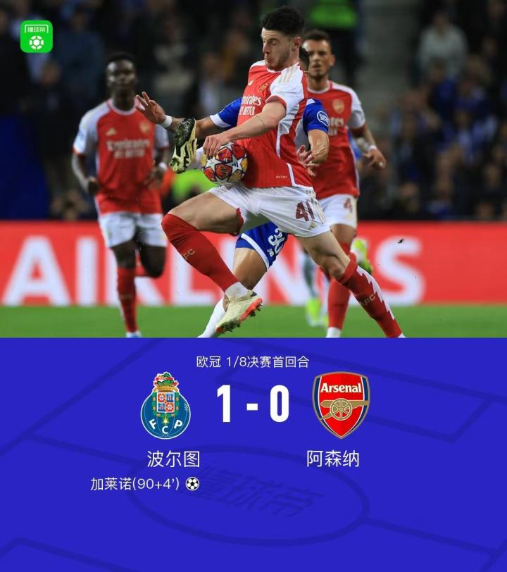 全场比赛,阿森纳高达70%的控球率,并未换来一脚射正。读秒阶段,波尔图逼出马丁内利出球失误,加莱诺禁区外得球后果断起脚,洞穿了拉亚的十指关。本场失利后,阿森纳遭遇欧冠淘汰赛五连败,并且连续7次欧冠淘汰赛首回合输球,此前6次都未能翻盘晋级。