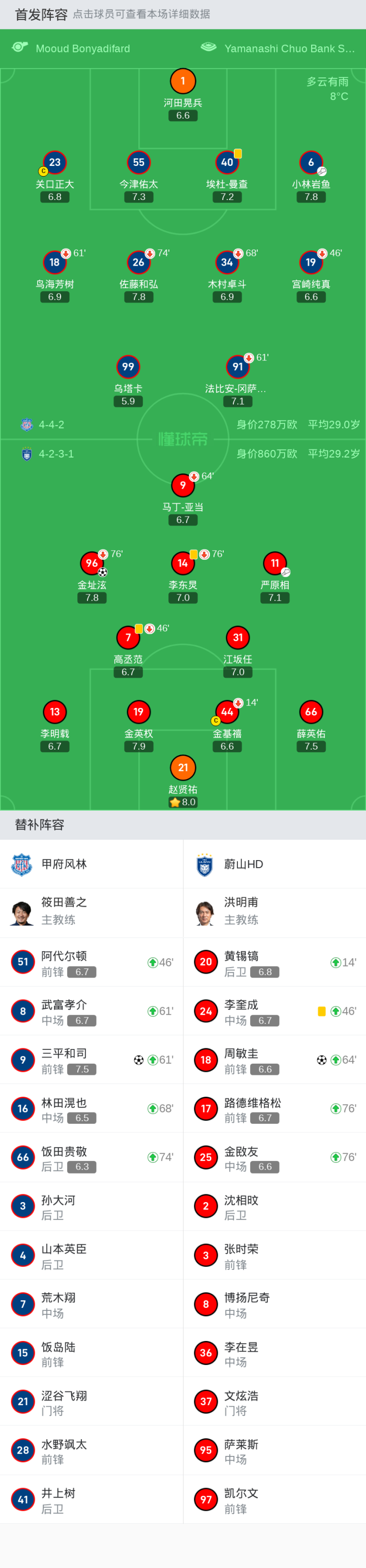 甲府风林首发:99-乌塔卡, 1-河田晃兵, 91-法比安-冈萨雷斯, 26-佐藤和弘, 55-今津佑太, 40-埃杜-曼查, 6-小林岩鱼, 19-宫崎纯真, 23-关口正大, 18-鸟海芳树, 34-木村卓斗