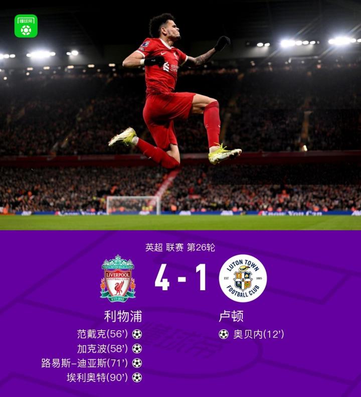 北京时间2月22日英超 联赛 第26轮,利物浦主场对阵卢顿。上半场迪亚斯多次打门未果,埃利奥特失良机,奥贝内头球补射破门,下半场范戴克头球扳平,加克波同样头球破门反超,迪亚斯突破低射扩大比分,埃利奥特百场里程碑抽射锁定胜局。最终利物浦4-1逆转卢顿。