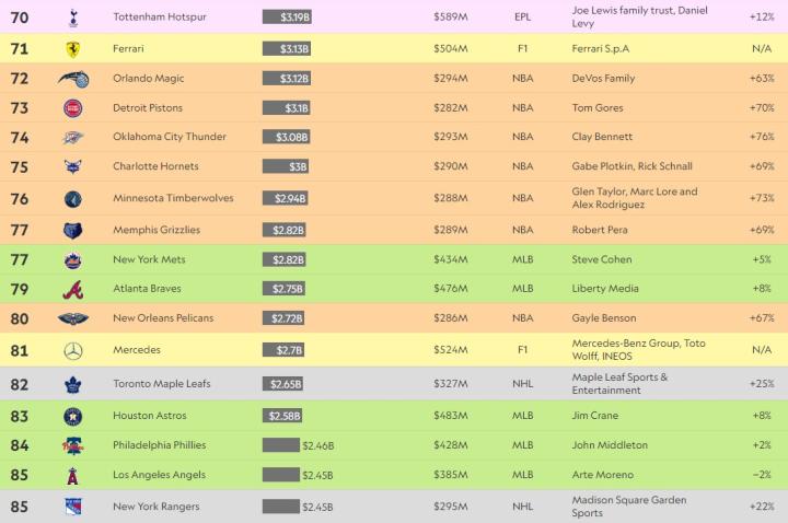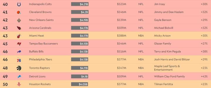 为了得出球队的市场价值,Sportico根据公开信息和财务记录以及对了解球队财务情况的人士(包括积极从事交易的体育银行家和律师)的采访来计算每支球队的收入。这些信息经过了团队人员的审查,包括所有者、团队或母公司首席执行官、总裁、首席财务官和媒体关系员工,以及行业专家和投资者。