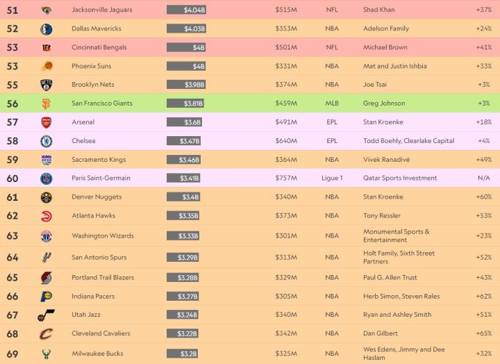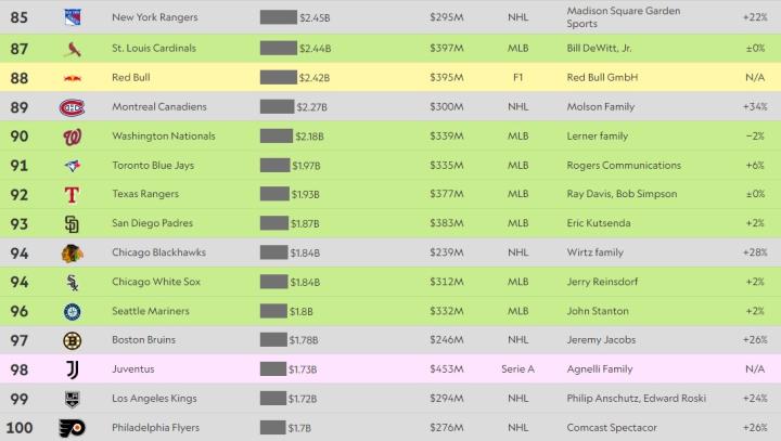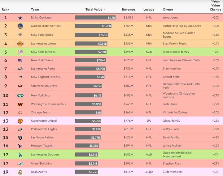 今日,体育商业媒体Sportico依据俱乐部相关产业价值以及俱乐部所拥有球馆等不动产价值对全球职业体育俱乐部进行了估值并排行。