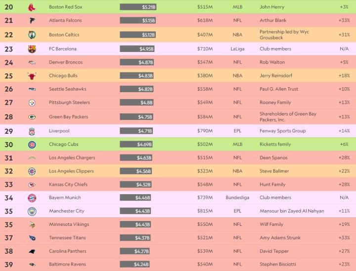 全球职业球队估值排名,曼联第13,皇萨分列19和23名