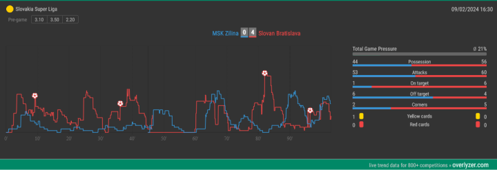 主教练弗拉基米尔·魏斯的球队目前领先联赛第二名的日利纳12分,上周,他们在客场以4-0的比分战胜了排名第二的球队。在20场联赛中,布拉迪斯拉发进了53个球,只丢了16个球。16胜3平,客场只输了一场,不言而喻。但是斯伐超毕竟竞争力有限,从图中来看,以红色图表为标志的布拉迪斯拉发显然统治了斯伐超联赛的顶级比赛,并在几乎整个90分钟内制造了更大的压力。