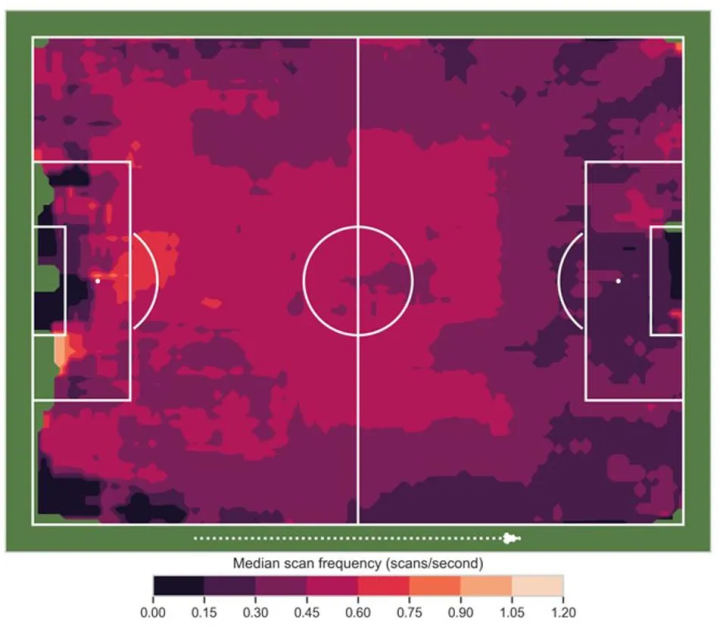 分析人员还挑选了27名来自英超精英俱乐部的球员,并对他们在杯赛以及联赛中总共9574次持球选择进行了分析。结果表明,从位置上看,中场球员的球场扫描次数最多,其次是中后卫,前锋最少。他们还观察到,传球前的扫描频率更高,而射门或运球时的频率较低。