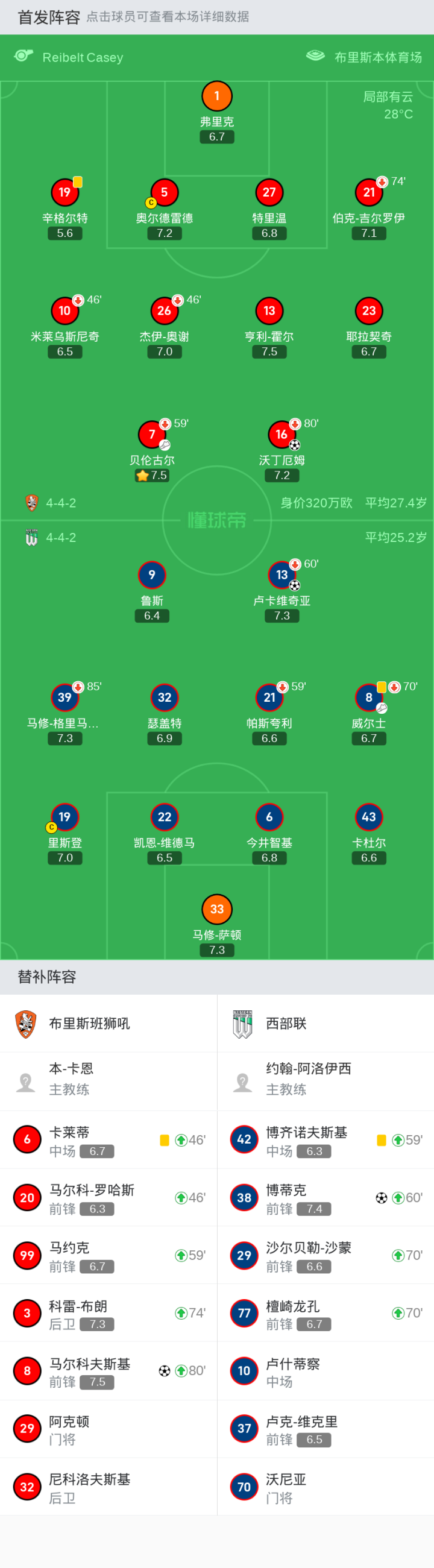 替换下场:46'26-杰伊-奥谢, 59'7-贝伦古尔, 46'10-米莱乌斯尼奇, 74'21-伯克-吉尔罗伊, 80'16-沃丁厄姆