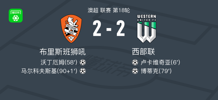 北京时间2月23日澳超 联赛 第18轮,布里斯班狮吼主场对阵西部联。布里斯班狮吼沃丁厄姆破门,马尔科夫斯基破门。西部联卢卡维奇亚破门,博蒂克破门。最终比分2-2。