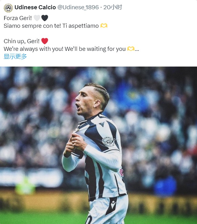 随后,乌迪内斯俱乐部官方发文写道道:“抬起头来Geri!我们一直和你在一起,我们会一直等你回来!”