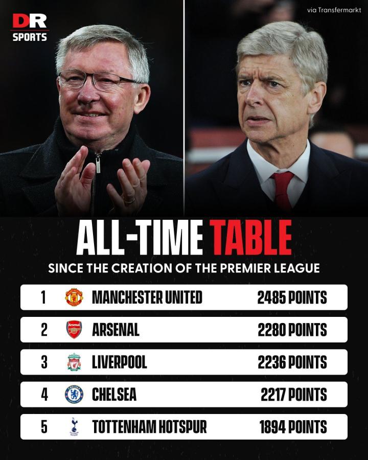 曼联仍然在英超联赛历史积分榜上遥遥领先! 🔝