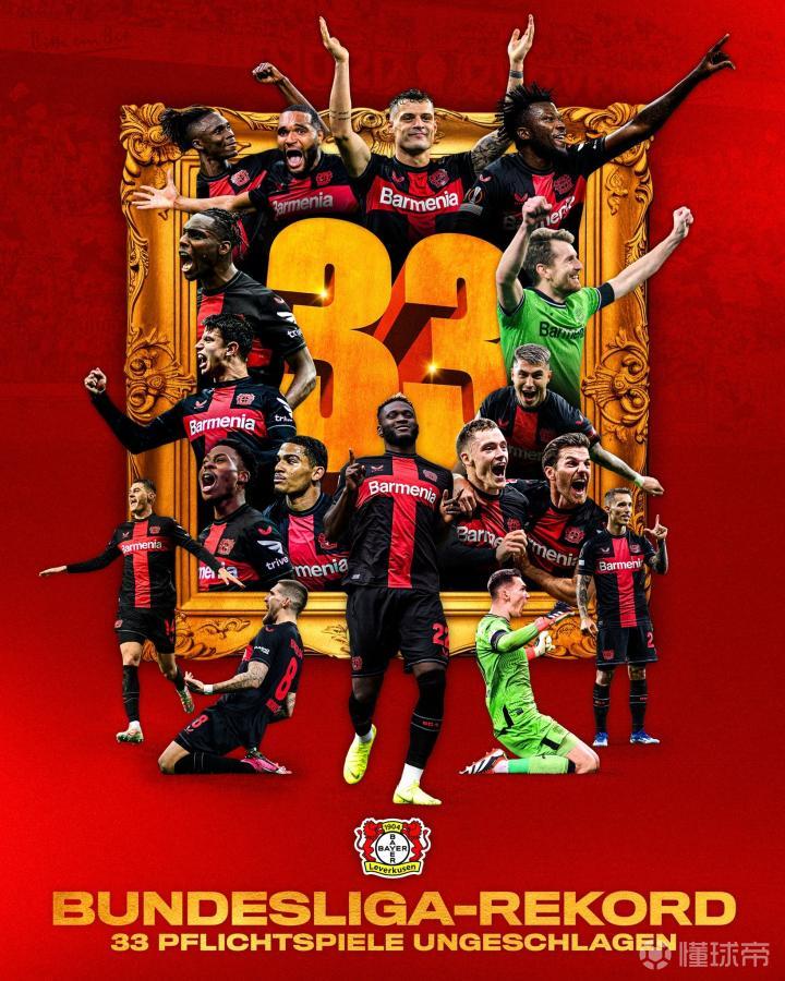 29胜4平,勒沃库森33场比赛不败创造德甲球队历史纪录