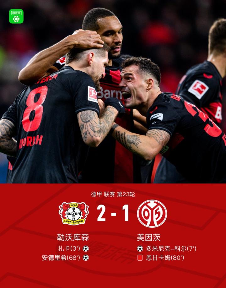 【勒沃库森2-1美因茨暂以11分优势领跑,安德里希、扎卡建功】