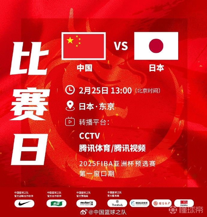 北京时间2月25日下午13:00,男篮亚洲杯预选赛小组赛第二轮,中国男篮将在客场对阵日本男篮。