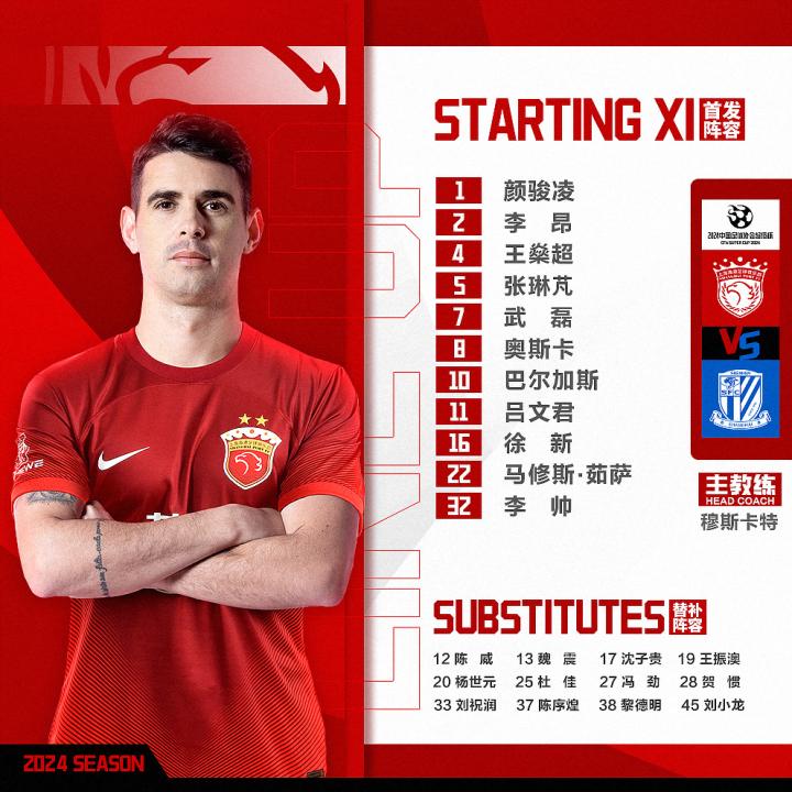 上海海港这边,主教练穆斯卡特安排3外援领衔首发,分别是奥斯卡、巴尔加斯、尤萨,奥斯卡还担任场上队长,守门员依然是颜骏凌,其他位置还有:李昂、王燊超、张琳芃、武磊、吕文君、徐新、李帅。