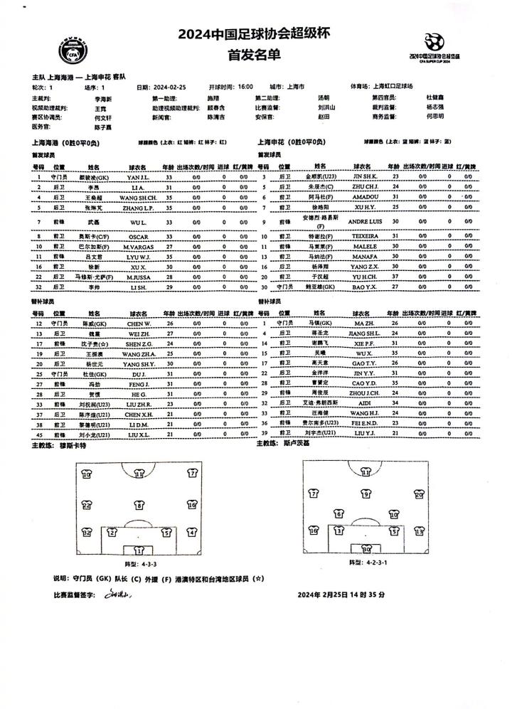 鲍亚雄司职门将,朱辰杰担任队长,金顺凯、徐皓阳、杨泽翔、于汉超同时首发。马镇、蒋圣龙、谢鹏飞、吴曦、高天意、金洋洋、曹赟定、周俊辰、艾迪、汪海建等球员现身替补席。