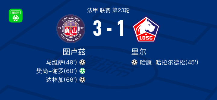 北京时间2月25日法甲 联赛 第23轮,图卢兹主场对阵里尔。图卢兹马维萨破门,达林加破门,樊尚-谢罗破门。里尔哈康-哈拉尔德松破门。最终比分3-1。